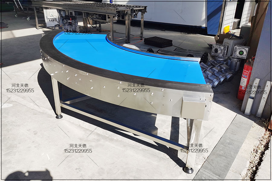物料與皮帶輸送帶間沒有相對運動,能夠避免對輸送物的損壞。 與其它轉彎輸送機相比噪音較小,適合于工作環境要求比較安靜的場合。