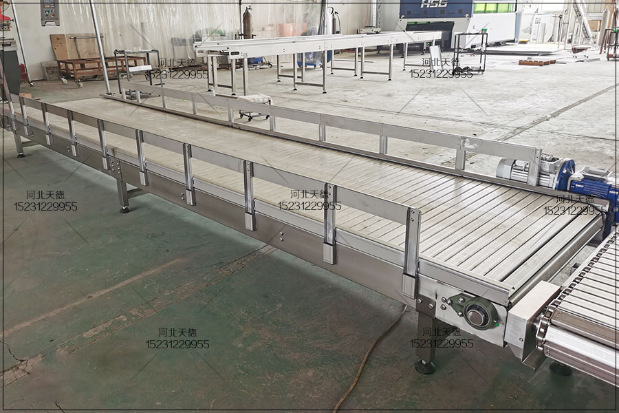 鏈板輸送機是用于食品、罐頭、化妝品與紙制品、調味品、乳業的主動輸送、調配跟后道包裝的連線輸送。鏈板輸送機能滿意各個飲料貼標 , 灌裝、蕩滌等輸送設備的單列輸送請求,同樣也可能由單列變成多列并且行走緩慢,從而產生貯存量,滿意殺菌機、儲瓶臺、冷瓶機的大量供料的 請求,可能將兩條鏈板輸送機的頭尾部做成重疊式的混淆鏈,使得瓶(罐)體處于動態適度狀況,使得輸送線上不滯留瓶子,可能實現空瓶與實瓶的壓力跟無壓力輸送。