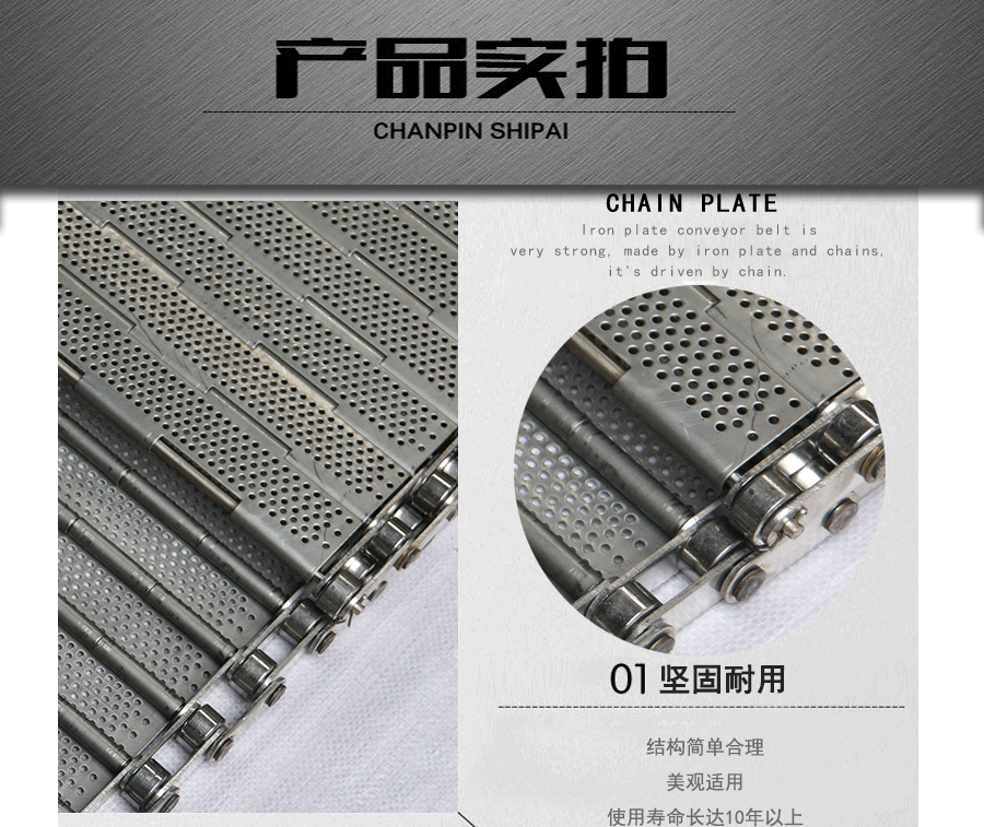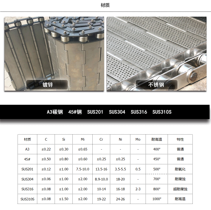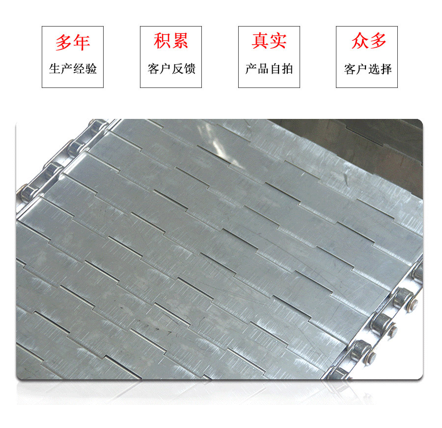 鏈板輸送帶材質:A3低碳鋼,45#鋼,201不銹 鋼,304不銹鋼,316不銹鋼等。