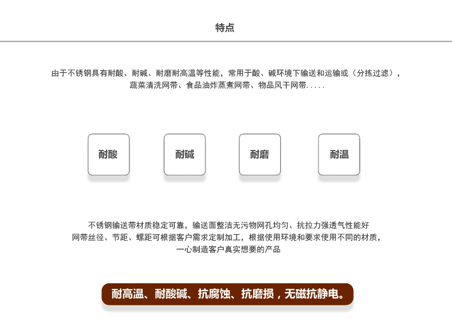 不銹鋼網帶屬于非標準件,我們將根據你提供的規格長寬,材質,絲徑,編制結構尺寸,支軸直徑,支軸間距,鏈條型號等數據核算成本和制作.