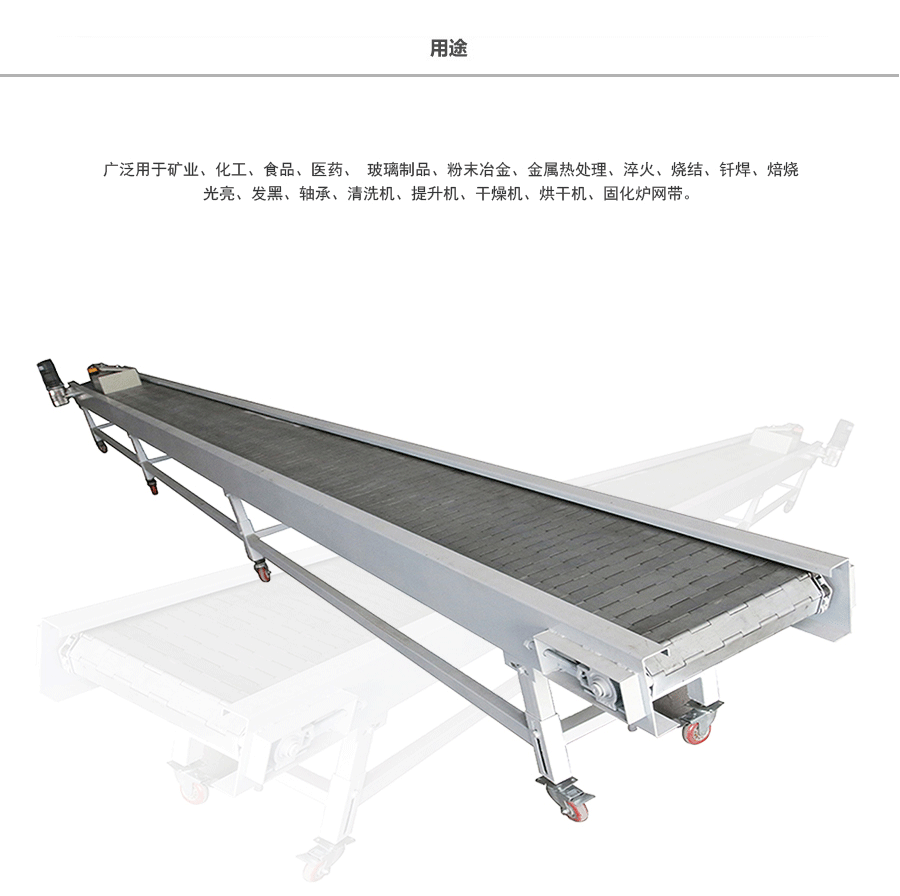 鏈板輸送帶應用:鏈板式網帶廣泛用于玻璃制品行業的退火爐鏈板、烤花爐鏈板等。食品加工行業、脫水蔬菜、速凍食品單凍機前處理鏈板、鏈網。粉末冶金、金屬熱處理、淬火、燒結、釬焊、焙燒、光亮、發黑、軸承、滲碳高溫爐鏈板、擋板式鏈板、涂裝烘干線輸送鏈板、泡沫鎳還原生產線鏈板,清洗機、提升機、干燥機、烘干機、固化爐鏈板。各輸送工藝鏈網、鏈板、速凍、烘烤機械的平面輸送、螺旋輸送、食品機械的清洗,殺 菌、烘干、冷 卻、蒸煮等玻璃機械的退火、烤花、輸瓶等。