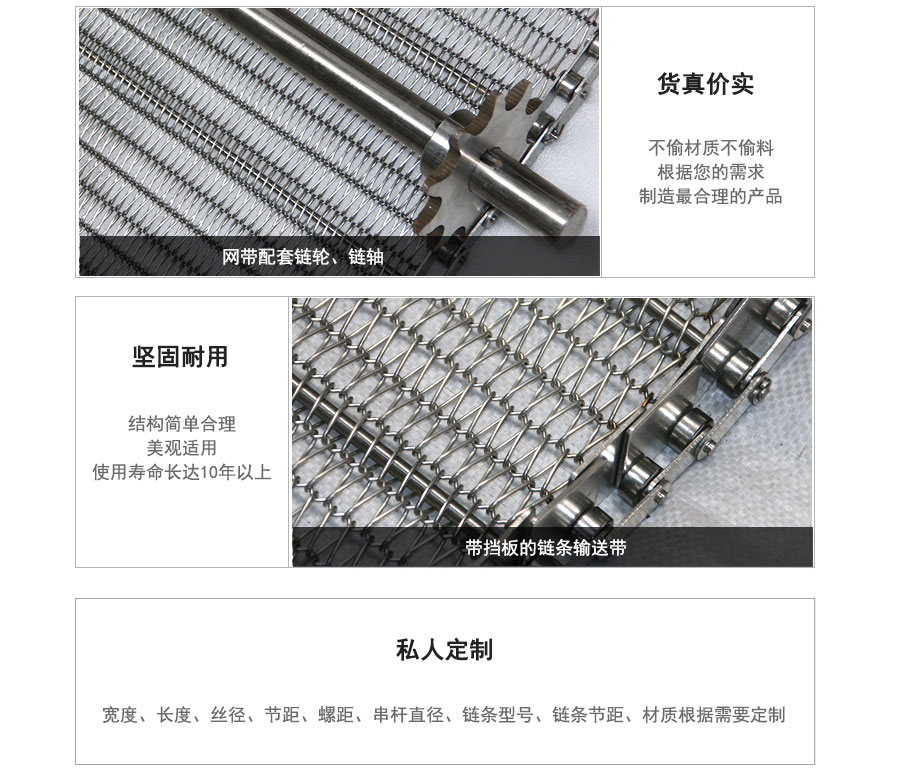 這種鏈桿式網帶采用鏈條傳動,適用于大型和重型傳送,其運動平穩、力量大,網面相對受力小,能對輸送網面起到保護作用,成本較貴,但使用壽命長。大開孔或者小開孔網條;溫度范圍零下55攝氏度到1150攝氏度;邊緣擋板和橫向擋板。