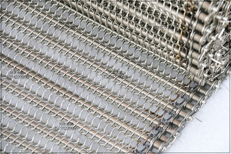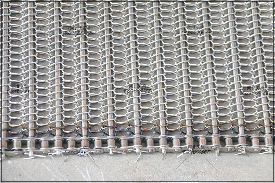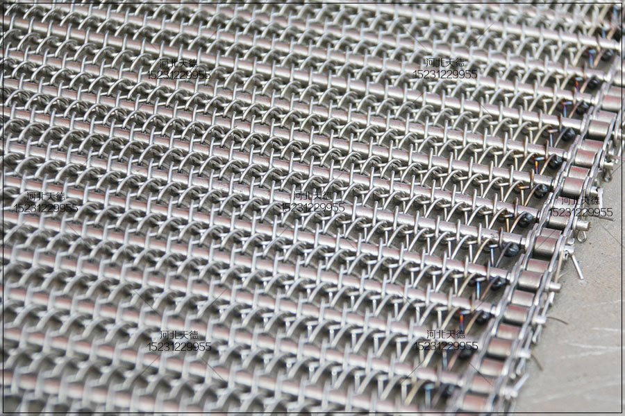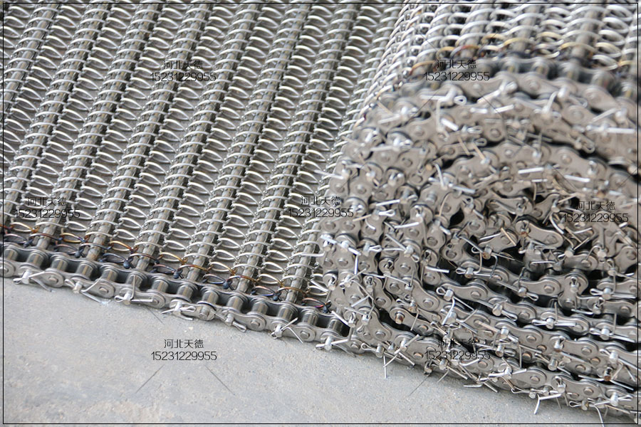 大滾珠輸送鏈輸送平穩,拉力大不跑偏,下面圖片展示的鏈條輸送帶總寬度是1米,長度為30米,絲徑采用1.5毫米的鋼絲壓彎編織的,編織孔大小為8*15毫米的。