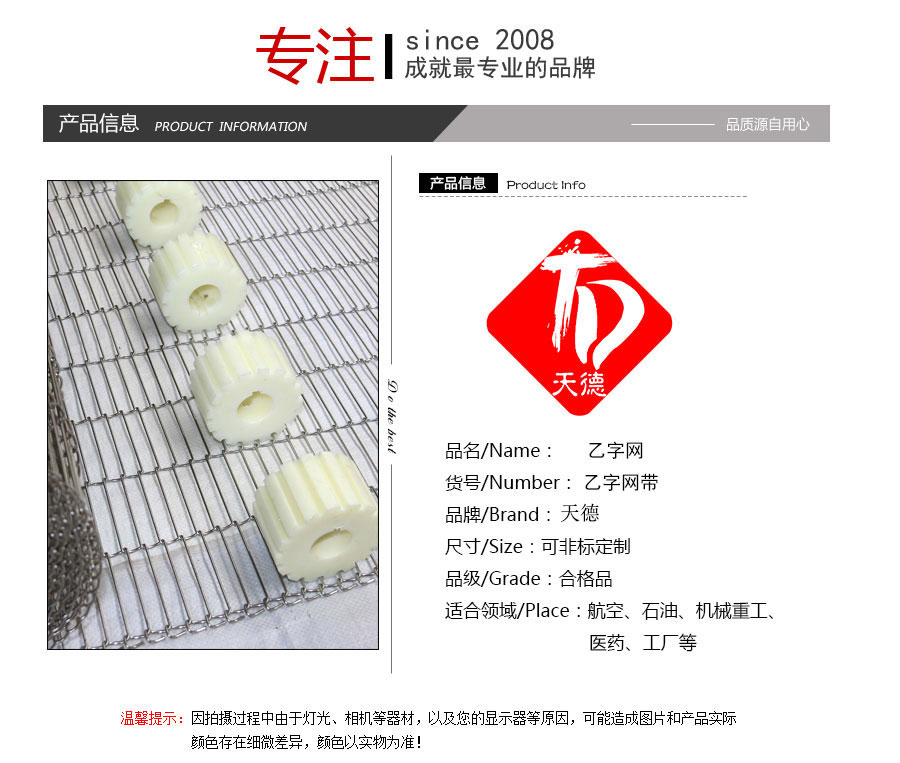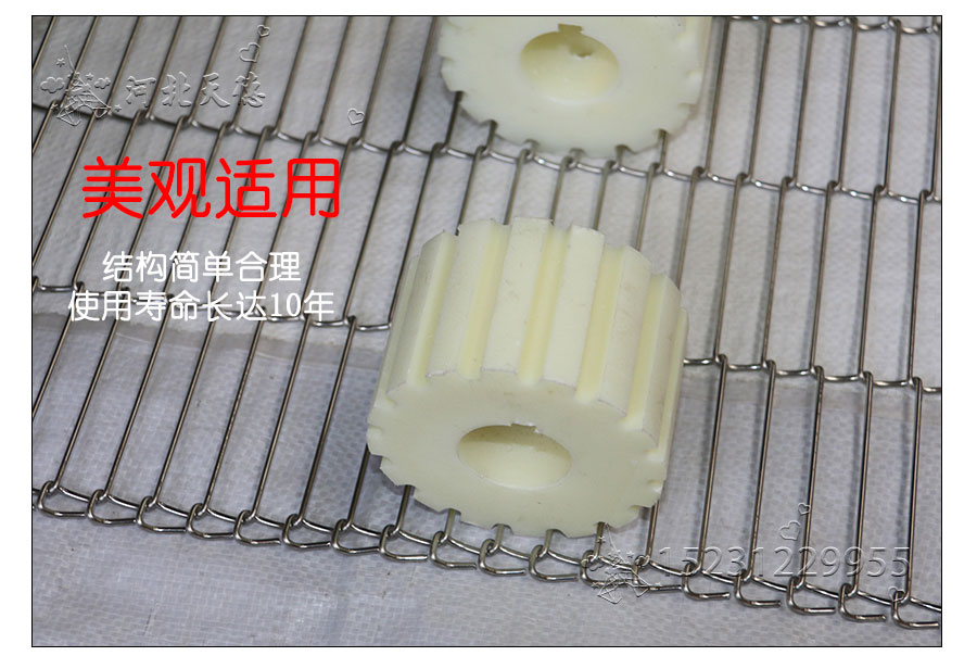 乙字網(wǎng)帶:又稱梯形網(wǎng)帶或一字網(wǎng),此網(wǎng)帶通常系齒輪傳遞網(wǎng)帶,具有透氣性好的優(yōu)點(diǎn),拉力均勻,做工精細(xì),此網(wǎng)帶具有轉(zhuǎn)動靈活、平穩(wěn)性好、耐高溫、耐壓力、耐腐蝕、壽命 長等特點(diǎn)。主要用于餅干機(jī)圖層,輕物品輸送及電子回流焊等