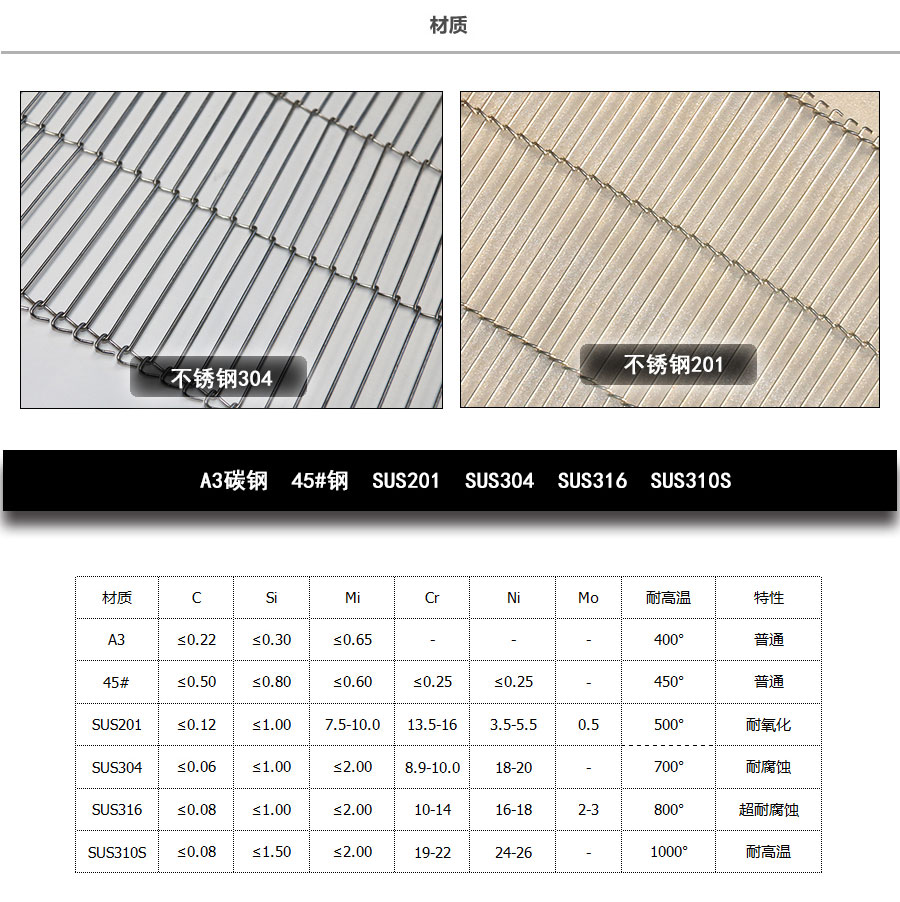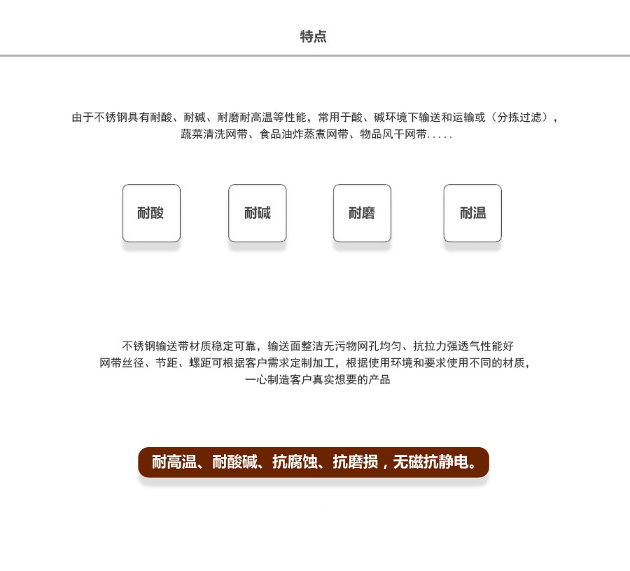 不銹鋼網(wǎng)帶屬于非標(biāo)準(zhǔn)件,我們將根據(jù)你提供的規(guī)格長寬,材質(zhì),不銹鋼絲線徑,編制結(jié)構(gòu)尺寸,支軸直徑,支軸間距,鏈條型號等數(shù)據(jù)制作.