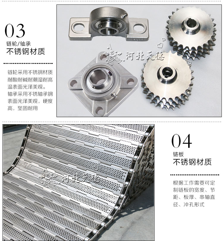 鏈板輸送機有兩大領域使用,那就是工業輸送和食品業輸送,這樣就有了鋼制鏈板輸送機和不銹鋼鏈板輸送機之分。這兩大系列中鏈板輸送機型號分烘干型、清洗型、自然輸送型、加重輸送型,這些型號各自對應著食品、藥材、金屬件的烘干,蔬菜、金屬件的清洗,各種產品的組裝、包裝流水線。